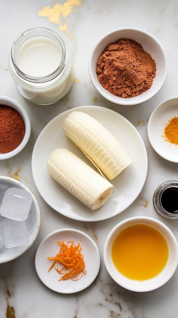 In a blender, add milk, chocolate protein powder, cocoa powder, frozen banana, fresh orange juice, orange zest, vanilla extract, and ice cubes.