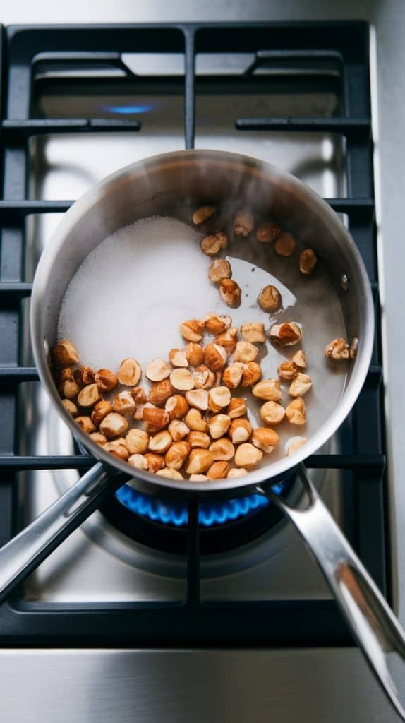 Add 1 cup water, 1 cup sugar, and 1/3 cup roasted hazelnuts to a medium saucepan. Heat over medium heat, stirring occasionally, until the sugar dissolves.