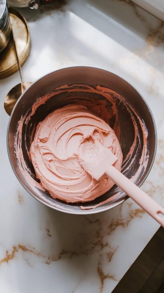 In a bowl, beat the butter until smooth, then gradually add powdered sugar. Mix in rosewater, heavy cream, and food coloring until smooth and creamy.